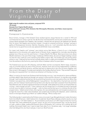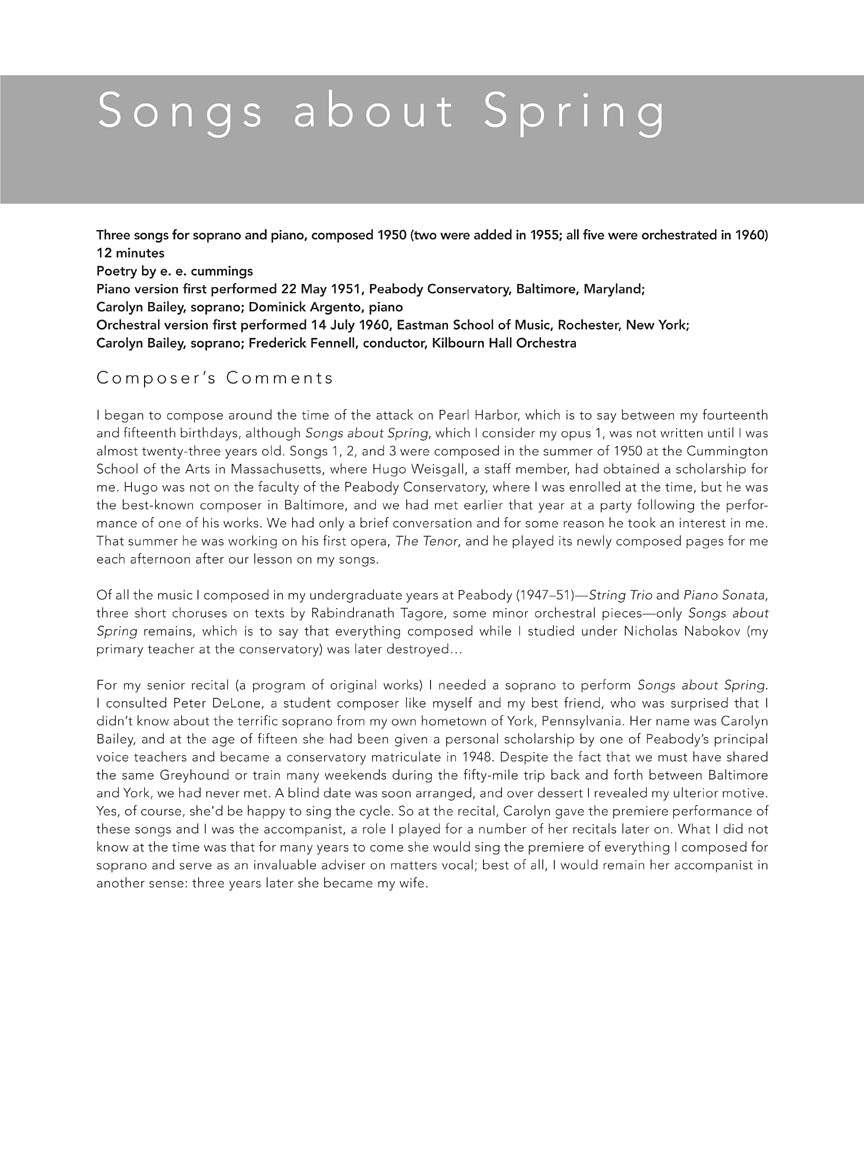 Contents: SONGS ABOUT SPRING: Who Knows if the Moon's a Balloon • Spring is like a Perhaps Hand • In Just-spring • In Spring Comes • When Faces Called Flowers Float out of the Ground • SIX ELIZABETHAN SONGS: Spring • Sleep • Winter • Dirge • Diaphenia • Hymn • FROM THE DIARY OF VIRGINIA WOOLF: The Diary • Anxiety • Fancy • Hardy's Funeral • Rome • War • Parents • Last Entry • THE ANDREE EXPEDITION: PART ONE: IN THE AIR: Prologue • the Balloon Rises • Pride and Ambition • Dinner Aloft • The Unforeseen Problem • the Flight Aborted • PART TWO: ON THE ICE: Mishap with a Sledge • The King's Jubilee • Illness and Drugs • Hallucinations • Anna's Birthday • Epilogue • Final Words • CASA GUIDI: Casa Guidi • The Italian Cook and the English Maid • Robert Browning • The Death of Mr. Barrett • Domesticity • MISS MANNERS ON MUSIC: Prologue • Manners at a Concert • Manners at the Ballet • Manners for Contemporary Music • Manners at a Church Recital • Manners at the Opera • Envoi