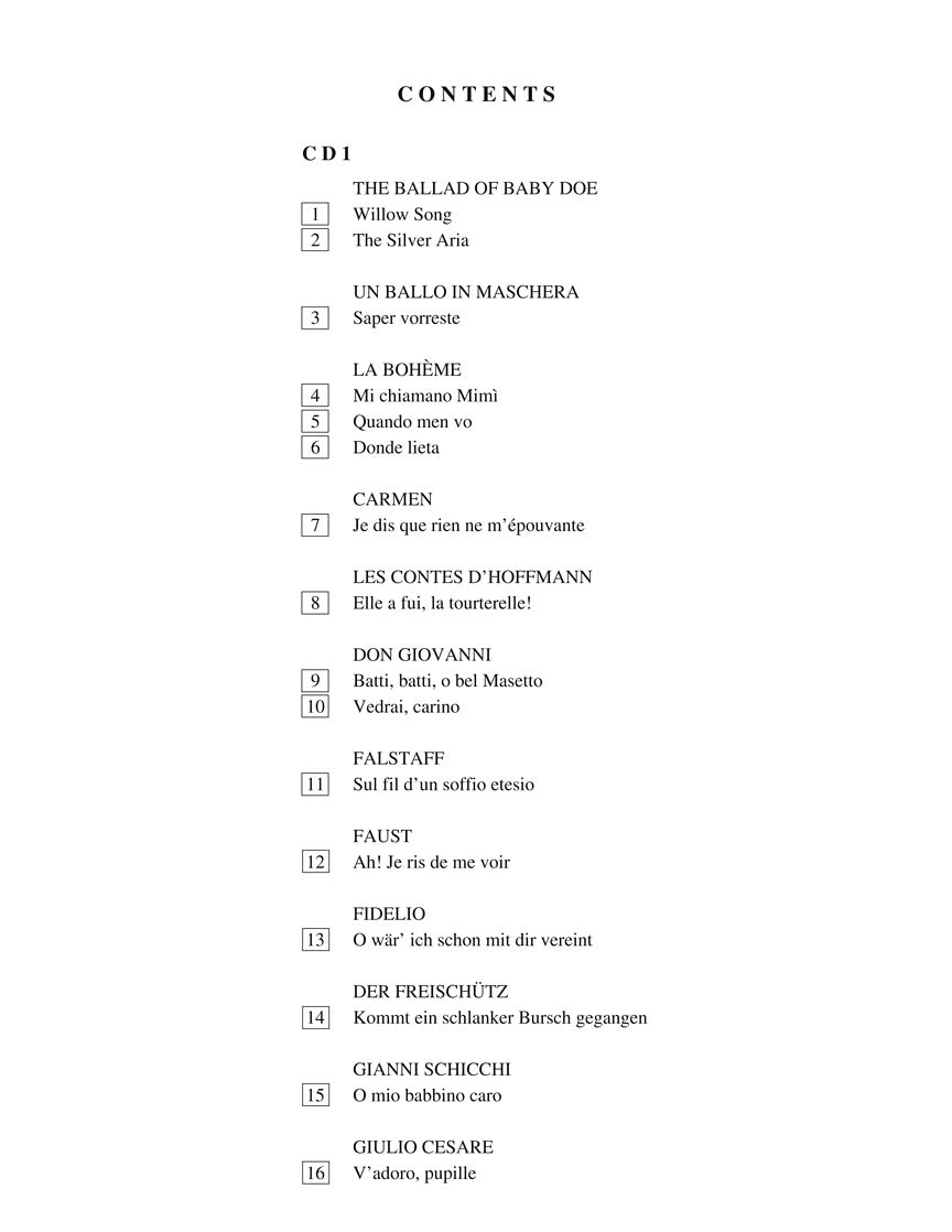Contents: Ach, Ich Fuhl's (The Magic Flute) • Adieu, Notre Petite Table (Massenet) • Ah Je Rise De Me Voir • Ah Je Veux Vivre • Batti, Batti, O Bel Masetto • Bester Jungling • The Black Swan • Caro Nome • Deh Vieni, Non Tardar (The Marriage Of Figaro) • Donde Lieta Usci • Dove Sono I Bei Momenti • Elle A Fui, La Tourterelle • Fair Robin I Love • Je Dis Que Rien Ne M'epouvante • Kommt Ein Schlanker Bursch Geg- • Mi Chiamano Mimi • Monica's Waltz • O Mio Babbino Caro • O War' Ich Schon Mit Dir Vereint • Porgi, amor from Le Nozze di Figaro • Quando Men Vo • Saper Vorreste (Verdi) • Signore Ascolta • The Silver Aria • Stridono Lassu • Sul Fil D'un Soffio (Verdi) • Tu Che Di Gel Sei Cinta • Un Bel Di Vedremo • V'adoro, Pupille • Vedrai, Carino • Willow Song