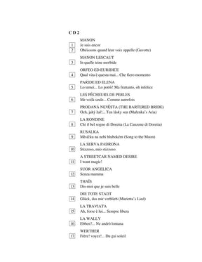 CONTENTS: THE BALLAD OF BABY DOE: Dearest Mama • I CAPULETI E I MONTECCHI: Oh! quante volte • LA CLEMENZA DI TITO: S'altro che lacrime • COSI FAN TUTTE: In uomini, in soldati, Una Donna a quindici anni • DIE ENTFUHRUNG AUS DEM SERAIL: Ach, ich liebte, war so glucklich • DIE FLEDERMAUS: Klange der Heimat (Csardas) • DER FREISCHUTZ: Einst traumte meiner sel'gen Base... Trube Augen • GIULIO CESARE: Non disperar Piangero la sorte mia • HERODIADE: Il est doux, il est bon • HMS PINAFOREA: Simple Sailor Lowly Born • IDOMENEO: Zeffiretti lusinghieri • LOUISE: Depuis le jour • DIE LUSTIGE WITWE: Es lebt' eine Vilja (Vilia) • MANON: Je suis encor, Obeissons quand leur voix appelle (Gavotte) • MANON LESCAUT: In quelle trine morbide • ORFEO ED URIDICE: Qual vita e questa mai... Che fiero momento • PARIDE ED ELENA: Lo temei... Lo potro! Ma frattanto, oh infelice • LES PECHEURS DE PERLES: Me voila seule... Comme autrefois • PRODANA NEVESTA (THE BARTERED BRIDE): Och, jaky zal!... Ten lasky sen (Marenka's Aria) • LA RONDINE: Chi il bel sogno di Doretta (La Canzone di Doretta) • RUSALKA: Mesicku na nebi hlubokem (Song to the Moon) • LA SERVA PADRONA: Stizzoso, mio stizzoso • A STREETCAR NAMED DESIRE: I want magic! • SOUR ANGELICA: Senza mamma • Thais: Dis moi que je suis belle • DIE TOTE STADT: Gluck, das mir verblieb (Marietta's Lied) • LA TRAVIATA: Ah, forse e lui... Sempre libera • LA WALLY: Ebben?... Ne andro lontana • WERTHER: Frere! voyez!... Du gai soleil
