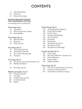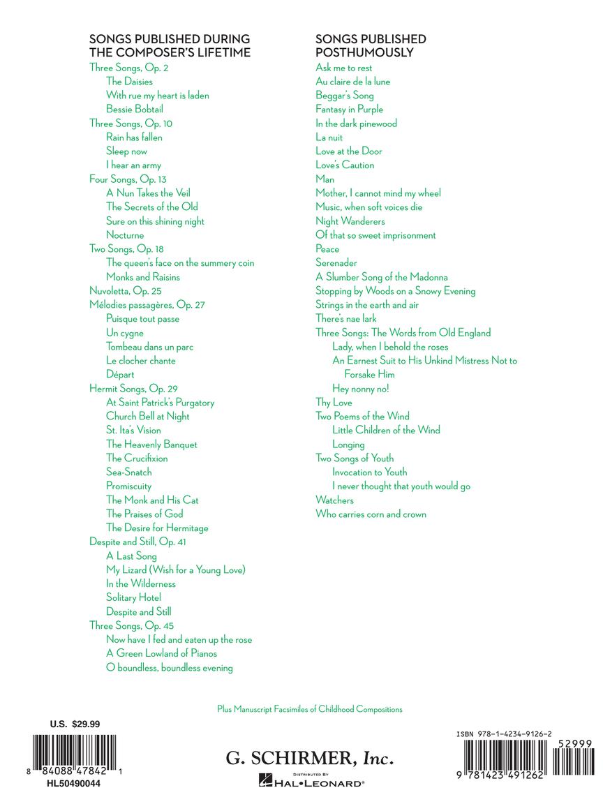 Three Songs, Op. 2: The Daisies; With rue my heart is laden; Bessie Bobtail • Three Songs, Op. 10: Rain has fallen; Sleep now; I hear an army • Four Songs, Op. 13: A Nun Takes the Veil; The Secrets of the Old; Sure on this shining night; Nocturne • Two Songs, Op. 18: The queen's face on the summery coin; Monks and Raisins • Nuvoletta, Op. 25 o Mélodies passagères, Op. 27: Puisque tout passé; Un cygne; Tombeau dans un parc; Le clocher chante; Départ • Hermit Songs, Op. 29: At Saint Patrick's Purgatory; Church Bell at Night; St. Ita's Vision; The Heavenly Banquet; The Crucifixion; Sea-Snatch; Promiscuity; The Monk and His Cat; The Praises of God; The Desire for Hermitage • Despite and Still, Op. 41: A Last Song; My Lizard (Wish for Young Love); In the Wilderness; Solitary Hotel; Despite and Still • Three Songs, Op. 45: Now have I fed and eaten up the rose; A Green Lowland of Pianos; O boundless, boundless evening