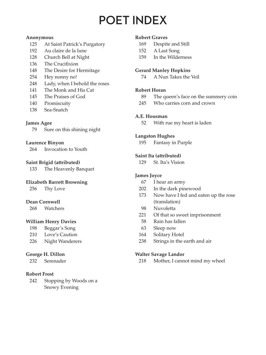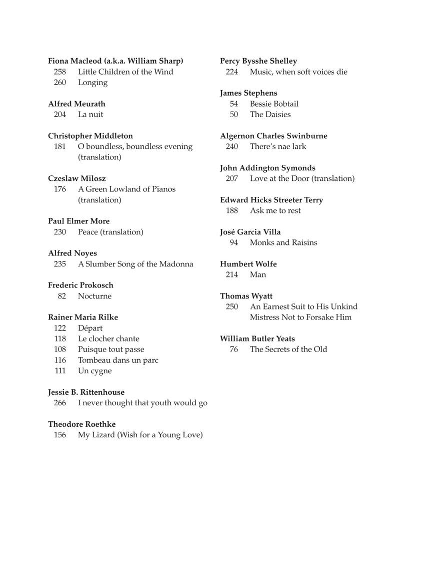 Ask me to rest 1 • Au claire de lune 1 • Beggar's Song 2 • Fantasy in Purple 1 • In the dark pinewood 2 • La nuit 1 • Love at the Door 2 • Love's Caution 2 • Man 1 • Mother, I cannot mind my wheel 3 • Music, when soft voices die 1 • Night Wanderers 2 • Of that so sweet imprisonment 2 • Peace 1 • Serenader 2 • A Slumber Song of the Madonna 2 • Stopping by Woods on a Snowy Evening 1 • Strings in the earth and air 2 • There's nae lark 2 • Three Songs, The Words from Old England: Lady, when I behold the roses 1; An Earnest Visit to His Unkind Mistress Not to Forsake Him 1; Hey nonny no! 3 • Two Poems of the Wind: Little Children of the Wind 1; Longing 1 • Two Songs of Youth: I never thought that youth would go 1; Invocation to Youth • Watchers 1 • Who carries corn and crown 1