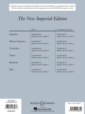 These collections of 30 songs each, released over 50 years ago, have been a mainstay of classical vocal study. There is a different song list for each voice type. Now accompaniment CDs are available that match each book. Special CD-ROM features are added to the audio CD which allow the tempo on the accompaniments to be adjusted without changing the pitch, or also, allow transposition.