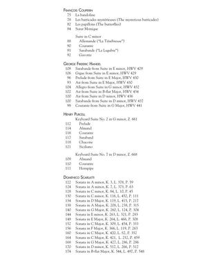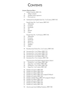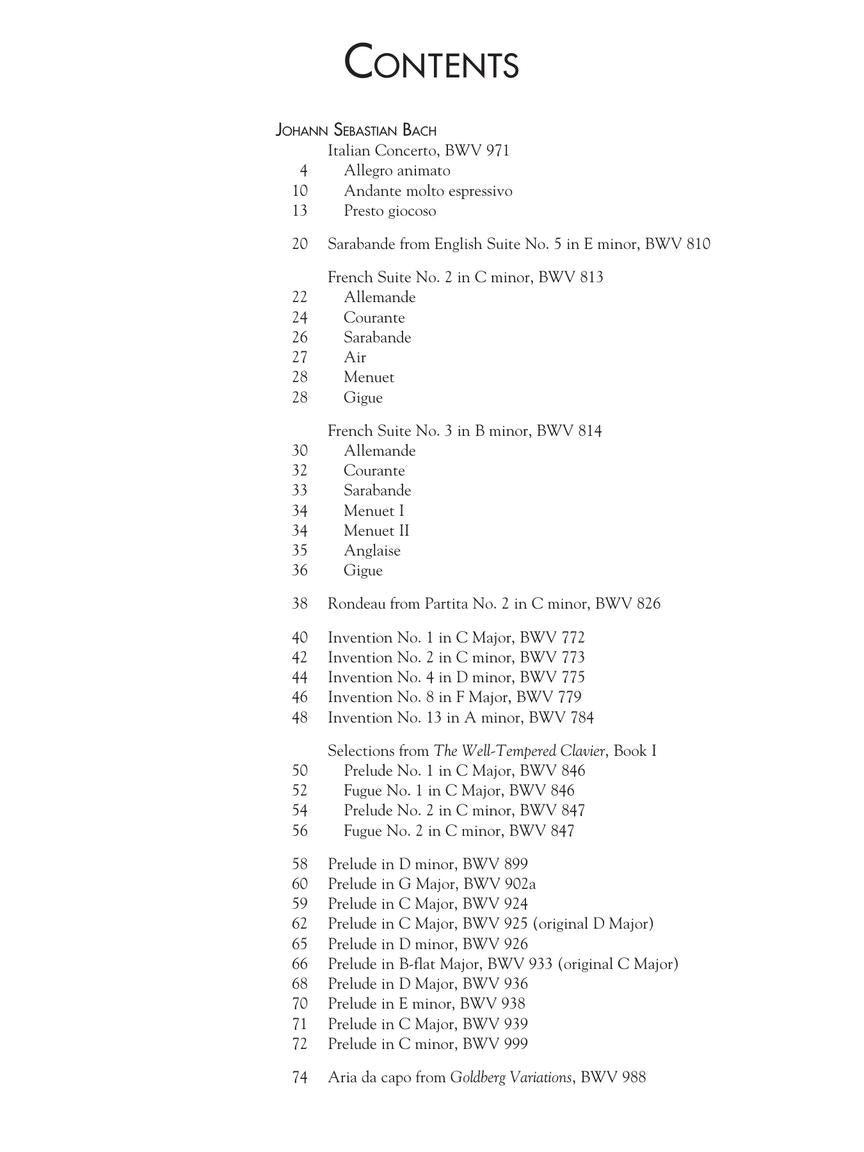 Contents: BACH: Italian Concerto, BWV 971 • Sarabande from English Suite No. 5, BWV 810 • French Suite No. 2, BWV 813 • French Suite No. 3, BWV 814 • Rondeau from Partita No. 2, BWV 826 • Invention No. 1, BWV 772 • Invention No. 2, BWV 773 • Invention NO. 4, BWV 775 • Invention No. 8, BWV 779 • Invention No. 13, BWV 784 • Prelude & Fugue No. 1, BWV 846 • Prelude & Fugue No. 2, BWV 847 • Prelude, BWV 899 • Prelude, BWV 902a • Prelude BWV 924 • Prelude, BWV 925 • Prelude, BWV 926 • Prelude, BWV 933 • Prelude, BWV 936 • Prelude, BWV 938 • Prelude, BWV 939 • Prelude, BWV 999 • Aria from Goldberg Variations, BWV 988 • COUPERIN: La bandoline • Les barricades mysterieuses • Les papillons • Soeur Monique • Suite in C minor • HANDEL: Sarabande from Suite, HWV 429 • Gigue from Suite, HWV 429 • Prelude from Suite, HWV 430 • Air from Suite, HWV 430 • Allegro from Suite, HWV 432 • Air from Suite, HWV 434 • Air from Suite, HWV 436 • Sarabande from Suite, HWV 437 • Courante from Suite, HWV 441 • PURCELL: Keyboard Suite No. 2, Z. 661 • Keyboard Suite No. 7, Z. 668 • DOMENICO SCARLATTI SONATAS BY K. NUMBER: 3, 7, 84, 116, 119, 208, 260, 263, 264, 309, 366, 420, 421, 427, 517, 544