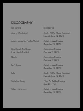 Note-for-note piano, bass and drum transcriptions of eight great tunes performed by the formidable trio of Bill Evans, Scott LaFaro and Paul Motian. Includes: Alice in Wonderland • Autumn Leaves (Les Feuilles Mortes) • How Deep Is the Ocean (How High Is the Sky) • Nardis • Peri's Scope • Solar • Waltz for Debby • When I Fall in Love.