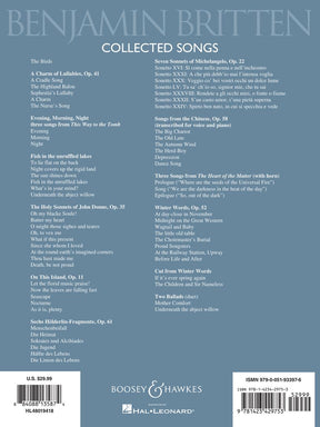 Contents: The Birds • A Charm of Lullabies (5 songs) • Evening, Morning, Night • Fish in the Unruffled Lakes (6 songs) • The Holy Sonnets of John Donne (8 songs) • On This Island (5 songs) • Sechs Hölderlin Fragmente (6 songs) • Seven Sonnets of Michelangelo) • Songs from the Chinese (6 songs, transcribed for voice and piano) • Three Songs from The Heart of the Matter (with horn) • Winter Words (8 songs plus 2 songs cut from the cycle) • Two Ballads (duets).