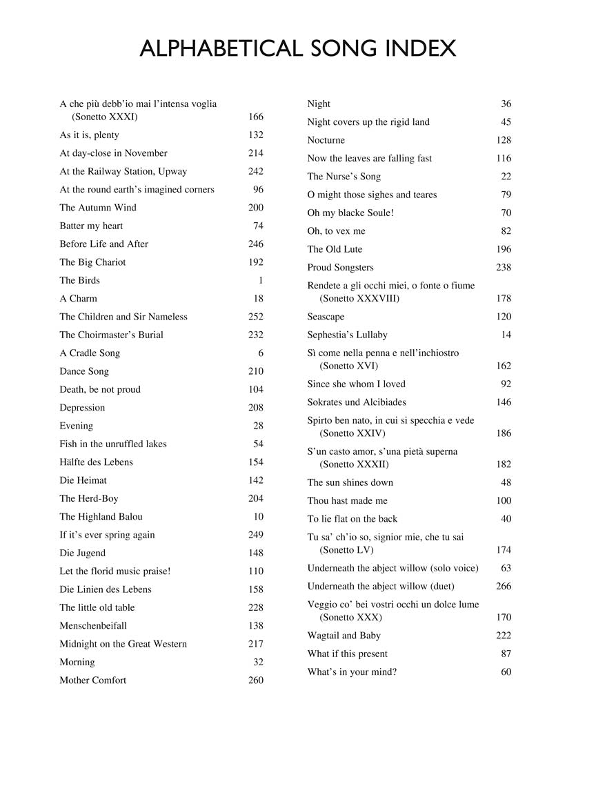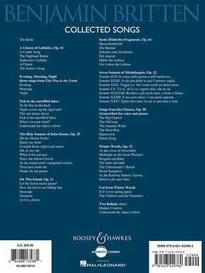 Contents: The Birds • A Charm of Lullabies (5 songs) • Evening, Morning, Night • Fish in the Unruffled Lakes (6 songs) • The Holy Sonnets of John Donne (8 songs) • On This Island (5 songs) • Sechs Hölderlin Fragmente (6 songs) • Seven Sonnets of Michelangelo) • Songs from the Chinese (6 songs, transcribed for voice and piano) • Winter Words (8 songs plus 2 songs cut from the cycle) • Two Ballads (duets).