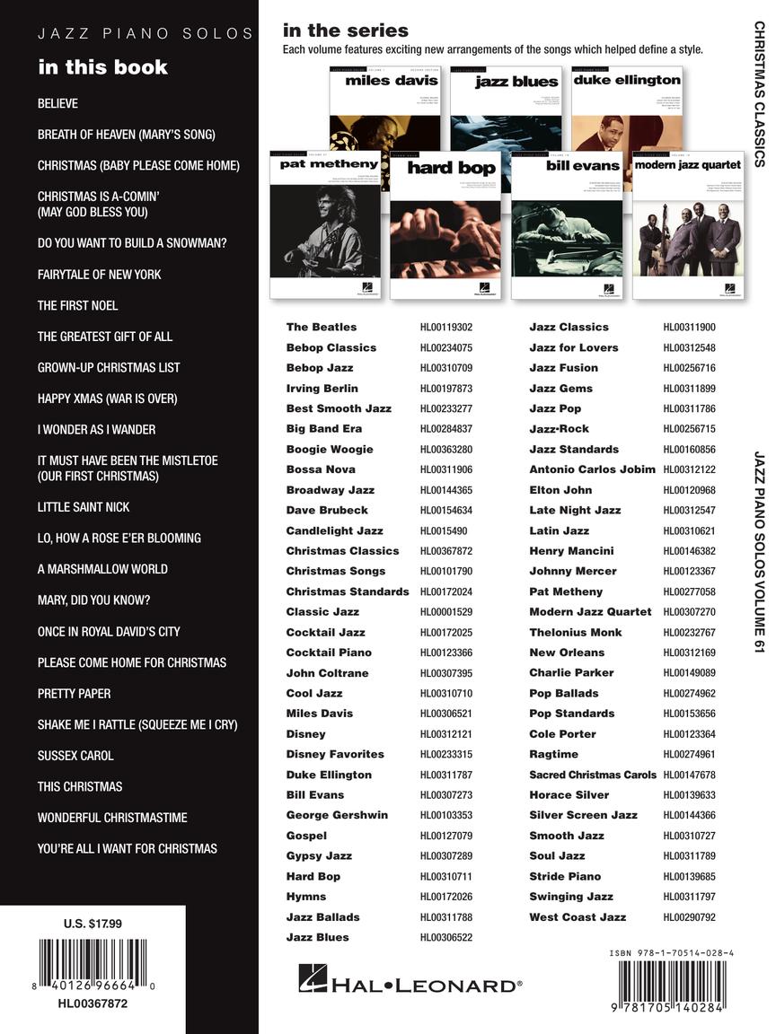 24 fun jazzy holiday arrangements complete with chord symbols, including: Believe • Christmas (Baby Please Come Home) • Do You Want to Build a Snowman? • Fairytale of New York • Happy Xmas (War Is Over) • Mary, Did You Know? • Please Come Home for Christmas • Wonderful Christmastime • You're All I Want for Christmas • and more