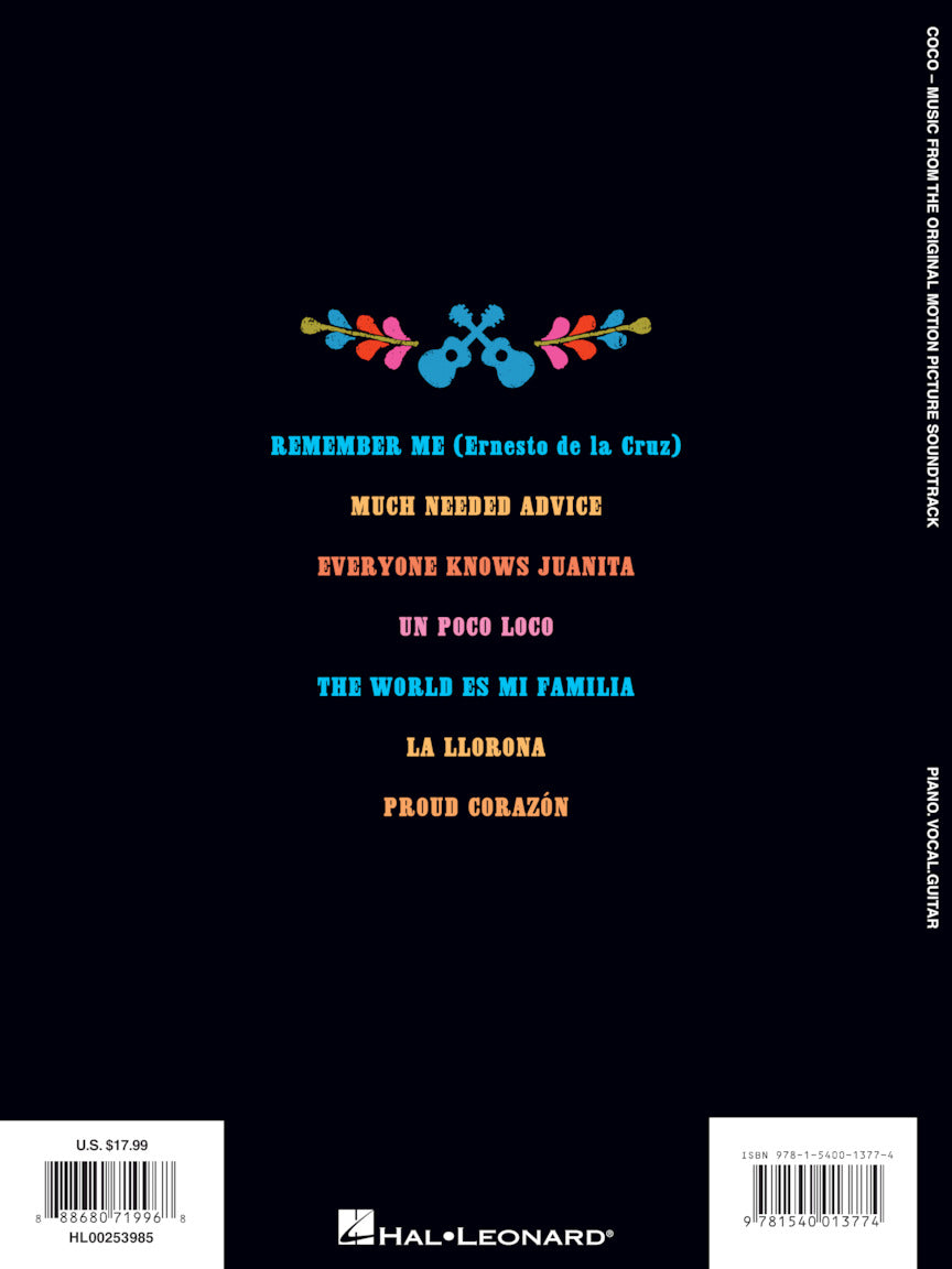 Here are 7 songs from the 2017 3D animated film from Disney/Pixar following the story of a boy named Miguel relating to a 100 year old mystery, including the signature song “Remember Me” by Kristen Anderson-Lopez & Robert Lopez; original songs “Everyone Knows Juanita,” “Proud Corazón,” “Un Poco Loco” and “The World Es Mi Familia” by Germaine Franco & Adrian Molina; and more. Includes 8 pages of beautiful full-color art from the film!