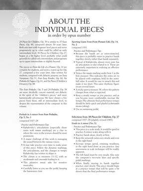 Kabalevsky often quoted Russian writer Maxim Gorky that books for children should be “the same as for adults, only better.” In one volume the miniature masterpieces that Kabalevsky composed for piano students have been grouped by level of difficulty, drawn from various sets. The composer believed that “no piece of music, however short and modest, should pass by a child without touching his mind and heart.”