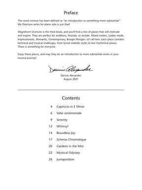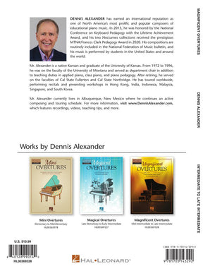 “Overture” has been defined as an introduction to something more substantial. Dennis Alexander's Overture series is just that! Magnificent Overtures is the final volume and features repertoire perfect for auditions, festivals, and recitals. Featuring everything from mixed meters to a romantic waltz to impressionism, it's all here! Titles: Boundless Joy • Capriccio in E Minor • Gardens in the Mist • Juxtaposition • Mystical Odyssey • Scherzo Chromatique • Serenity • • Whimsy! • Valse Sentimentale.