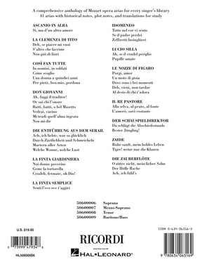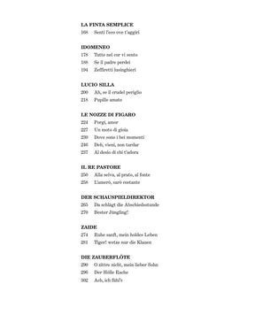Contents: ASCANIO IN ALBA: Si, ma d'un altro amore • LA CLEMENZA DI TITO: Deh, se piacer mi vuoi, S'altro che lacrime, Non piu di fiori • COSI FAN TUTTE: In uomini, in soldati, Come scoglio, Una donna a quindici anni, Per pieta, ben mio, perdona • DON GIOVANNI: Ah, fuggi il traditor!, Or sai chi l'onore, Batti, batti, o bel Masetto, Vedrai, carino, Mi tradi, quell'alma ingrata, Non mi dir • DIE ENTFUHRUNG AUS DEM SERAIL: Ach, ich liebte, war so glucklich, Durch Zartlichkeit und Schmeicheln, Martern aller Arten, Welche Wonne, welche Lust • LA FINTA GIARDINIERA: Noi donne poverine, Geme la tortorella, Crudeli, fermate, oh Dio! • LA FINTA SEMPLICE: Senti l'eco ove t'aggiri • IDOMENEO: Tutte nel cor vi sento, Se il padre perdei, Zeffiretti lusinghieri • LUCIO SILLA: Ah, se il crudel periglio, Pupille amate • LE NOZZE DI FIGARO: Porgi, amor, Un moto di gioia, Dove sono i bei momenti, Deh, vieni, non tardar, Al desio di chi t'adora • IL RE PASTORE: Alla selva, al prato, al fonte, L'amero, saro costante • DER SCHAUSPIELDIREKTOR: Daschlagt die Abschiedsstunde, Bester, Jungling! • ZAIDE: Ruhe sanft, mein holdes Leben, Tiger! wetze nur die Klauen • DIE ZAUBERFLOTE: O zittre nicht, mein lieber Sohn, Der Holle Rache, Ach, ich fuhl's