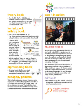 The 2nd Edition Primer Level Teacher Guide provides comprehensive support for instructing beginning students using the Fabers' student-centered curriculum. Included are updated lesson plans, tips for reinforcing concepts and skills, and ideas for creative music exploration. Watch Nancy Faber and her young students in over 60 model teaching videos. Review and reflect with 20 new pedagogy articles and “ask yourself” study questions. And prepare for group activities with new ensemble parts, stories, and extended teacher duets. Get inspired to Analyze, Create, and Express with your Primer students!