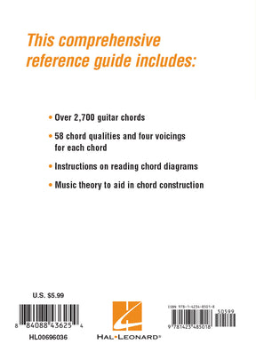 Quick – what's that chord? This compact reference guide includes: over 2,700 guitar chord diagrams in all 12 keys; 58 chord qualities and four voicings for each chord; instructions on reading chord diagrams; and music theory to aid in chord construction. Measuring just 4″ x 6″ inches, this info-packed volume is small enough to take everywhere!