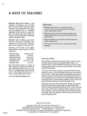 "PlayTime® Piano Jazz & Blues is a fun collection of beginning jazz and blues pieces. The book offers a pleasing variety of sounds – from soulful blues to jazz originals and standards – and is a wonderful supplement for the late Level 1 piano student. The student will enjoy creating the sounds of jazz and blues while improving reading and rhythmic skills. Songs include: Jeepers Creepers • Ain't She Sweet • Moon River • and more.