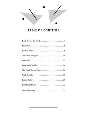 "A collection of rock and roll classics from the '50s and '60s. The selections offer fun and excitement at the lessons, while still providing practice in the basics. Includes: Rock Around the Clock • Surfer Girl • Rockin' Robin • The Green Mosquito • Cool Strut • Come Go With Me • The Purple People Eater • Walk Right In • Peanut Butter • Blue Suede Shoes