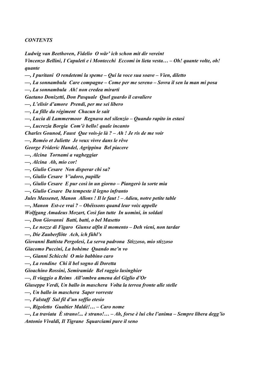 LUDWIG VAN BEETHOVEN Fidelio O wär' ich schon mit dir vereint • VINCENZO BELLINI I Capuleti e i Montecchi Eccomi in lieta vesta...-Oh! quante volte, oh! quante • I puritani O rendetemi la speme - Qui la voce sua soave - Vien, diletto • La sonnambula Care compagne - Come per me sereno - Sovra il sen la man mi posa • La sonnambula Ah! non credea mirarti • GAETANO DONIZETTI Don Pasquale Quel guardo il cavaliere • L'elisir d'amore Prendi, per me sei libero • La fille du régiment Chacun le sait • Lucia di Lammermoor Regnavanel silenzio - Quando rapito in estasi • Lucrezia Borgia Com'è bello! quale incanto • CHARLES GOUNOD Faust Que vois-je là ? - Ah ! Je ris de me voir • Roméo et Juliette Je veux vivre dans le rêve • GEORGE FRIDERIC HANDEL Agrippina Bel piacere • Alcina Tornami a vagheggiar • Alcina Ah, mio cor! • Giulio Cesare Non disperar chi sa? • Giulio Cesare V'adoro, pupille • Giulio Cesare E pur così inun giorno - Piangerò la sorte mia • Giulio Cesare Da tempeste il legno infranto • JULES MASSENET Manon Allons ! Il le faut ! - Adieu, notre petite table • Manon Est-ce vrai ? - Obéissons quand leur voix appelle • WOLFGANG AMADEUS MOZART Così fan tutte In uomini, in soldati • Don Giovanni Batti, batti, o bel Masetto • Le nozze di Figaro Giunse alfin il momento - Deh vieni, non tardar • Die Zauberflöte Ach, ich fühl's • GIOVANNI BATTISTA PERGOLESI La serva padrona Stizzoso, mio stizzoso • GIACOMO PUCCINI La bohème Quando me'n vo • Gianni Schicchi O mio babbino caro • La rondine Chi il bel sogno di Doretta • GIOACHINO ROSSINI Semiramide Bel raggio lusinghier • Il viaggio a Reims All'ombra amena del Giglio d'Or • GIUSEPPE VERDI Un ballo in maschera Volta la terrea fronte alle stelle • Un ballo in maschera Saper vorreste • Falstaff Sul fil d'un soffio etesio • Rigoletto Gualtier Maldè...-Caro nome • La traviata È strano!... è strano!...-Ah, forse è lui che l'anima - Sempre libera degg'io • ANTONIO VIVALDI Il Tigrane Squarciami pure il seno
