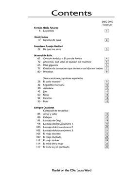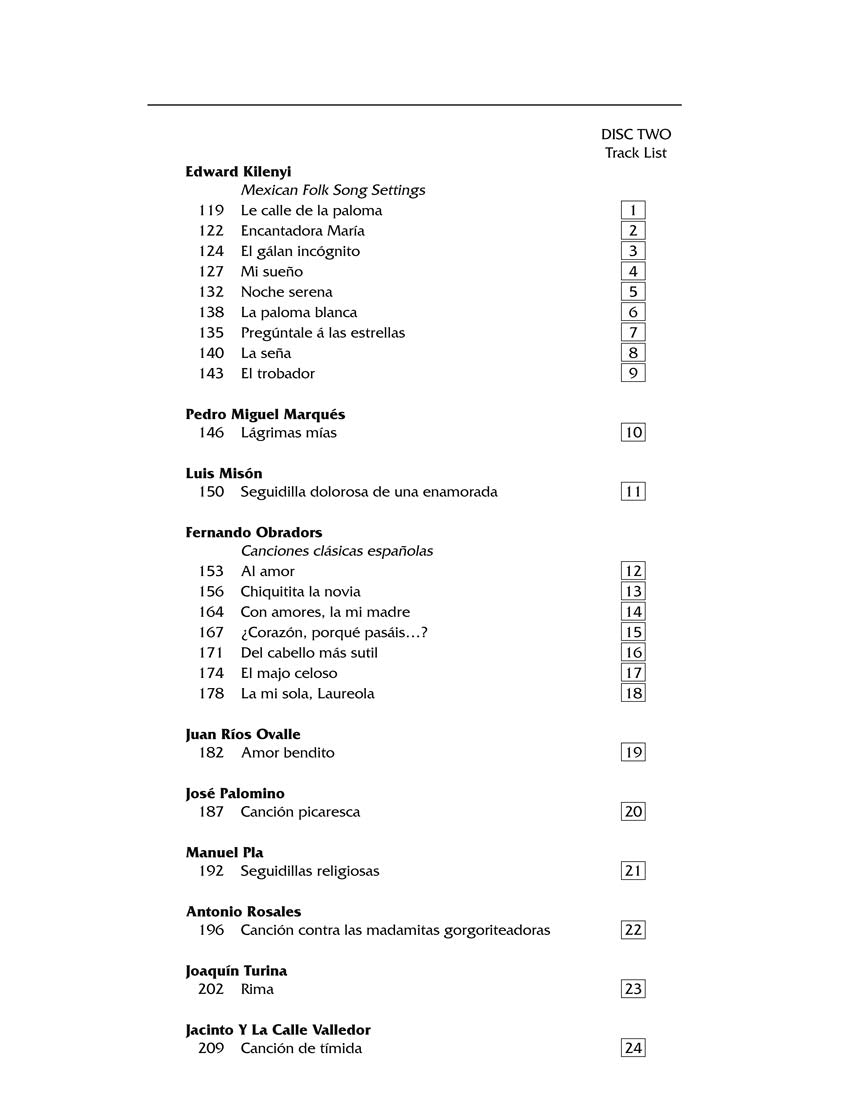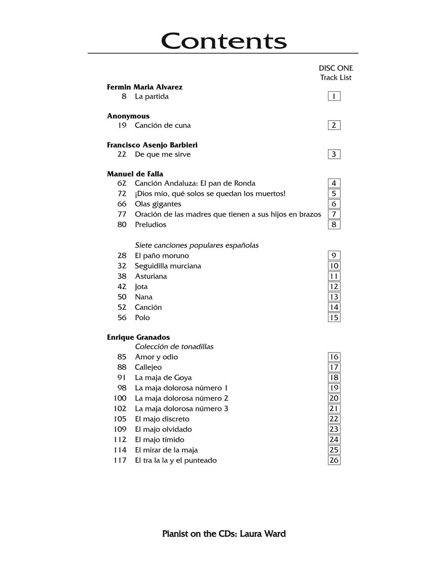 Contents: ALVAREZ: La partida • ANONYMOUS: Cancion de cuna • BARBIERI: De que me sirve • DE FALLA: Cancion Andaluza: El pan de Ronda, Dios mio, que solos se quedan los muertos!, Olas gigantes, Oracion de las madres que tienen a sus hijos en brazos, Preludios, Siete caniones populares espanolas • GRANADOS: Coleccion de tonadillas • KILENYI: Mexican Folk Song Settings • MARQUES: Lagrimas mias • MISON: Seguidilla dolorosa de una enamorada • OBRADORS: Caniones clasicas espanolas • OVALLE: Amor Bendito • PALOMINO: Cancion picaresca • PLA: Seguidillas religiosas• ROSALES: Cancion contra las madamitas gorgoriteadoras • TURINA: Rima • JACINTO Y LA CALLE VALLEDOR: Cancion de timida