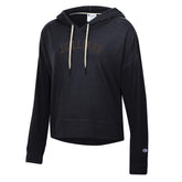 Soft sueded hooded sweatshirt with arched Juilliard in puff ink. Features self cuff and waistband, side vents, and dropped shoulder. Made of 88% polyester, 12% spandex sueded fleece. Ladies cut-- sizes XS-2XL.