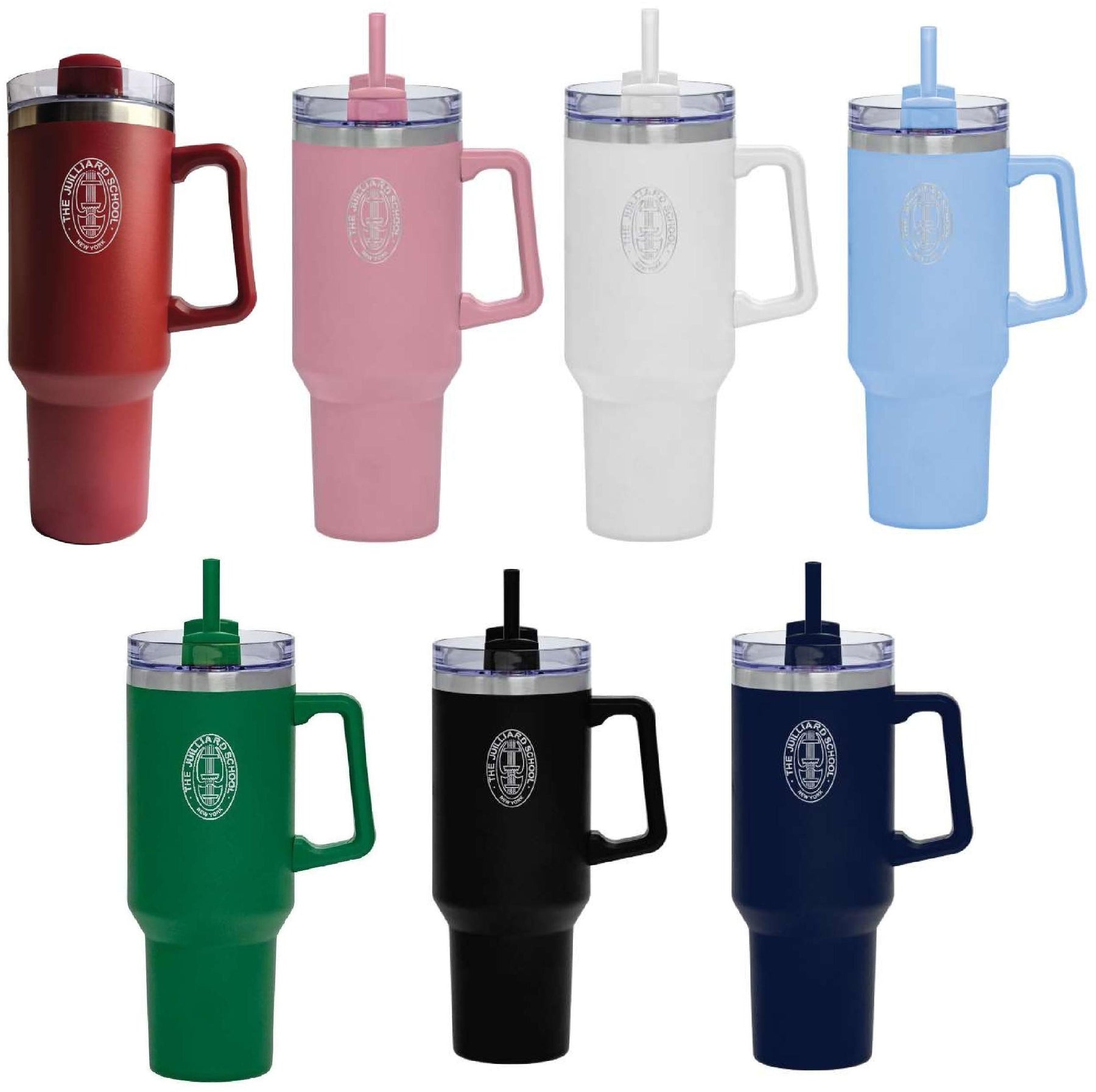 travel mug with matching straw and small laser etched Juilliard seal on front only. Hand wash recommended.